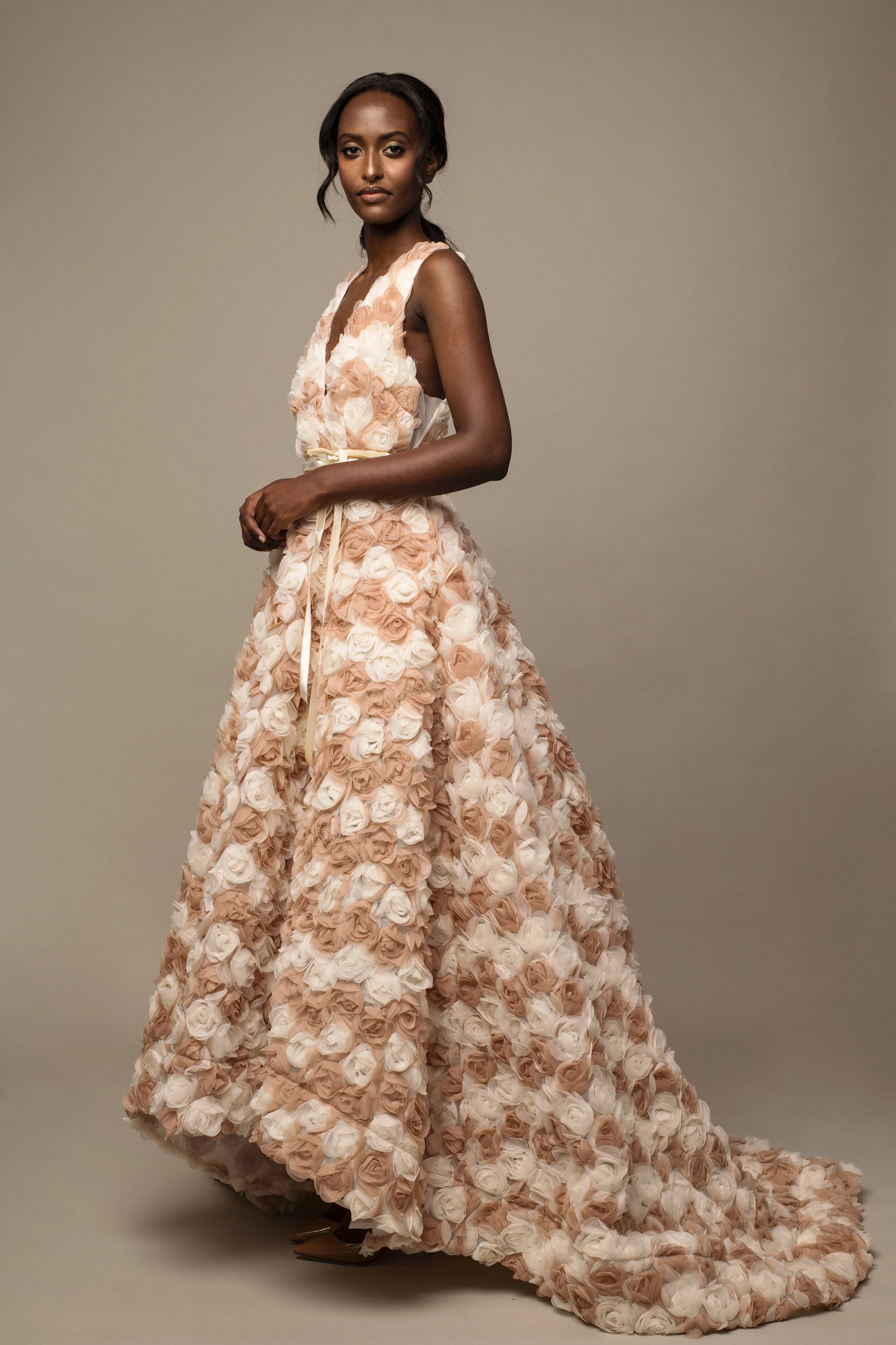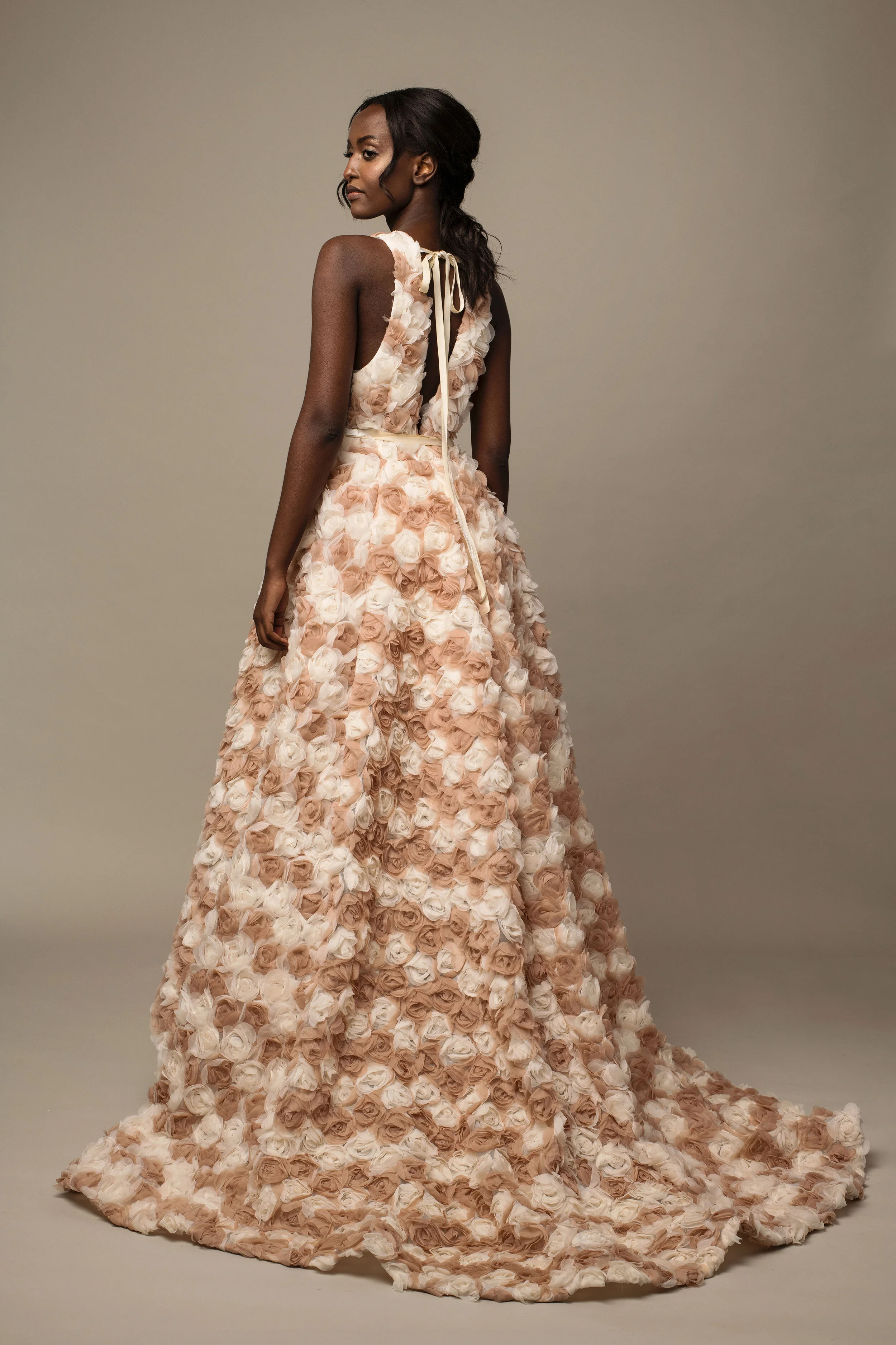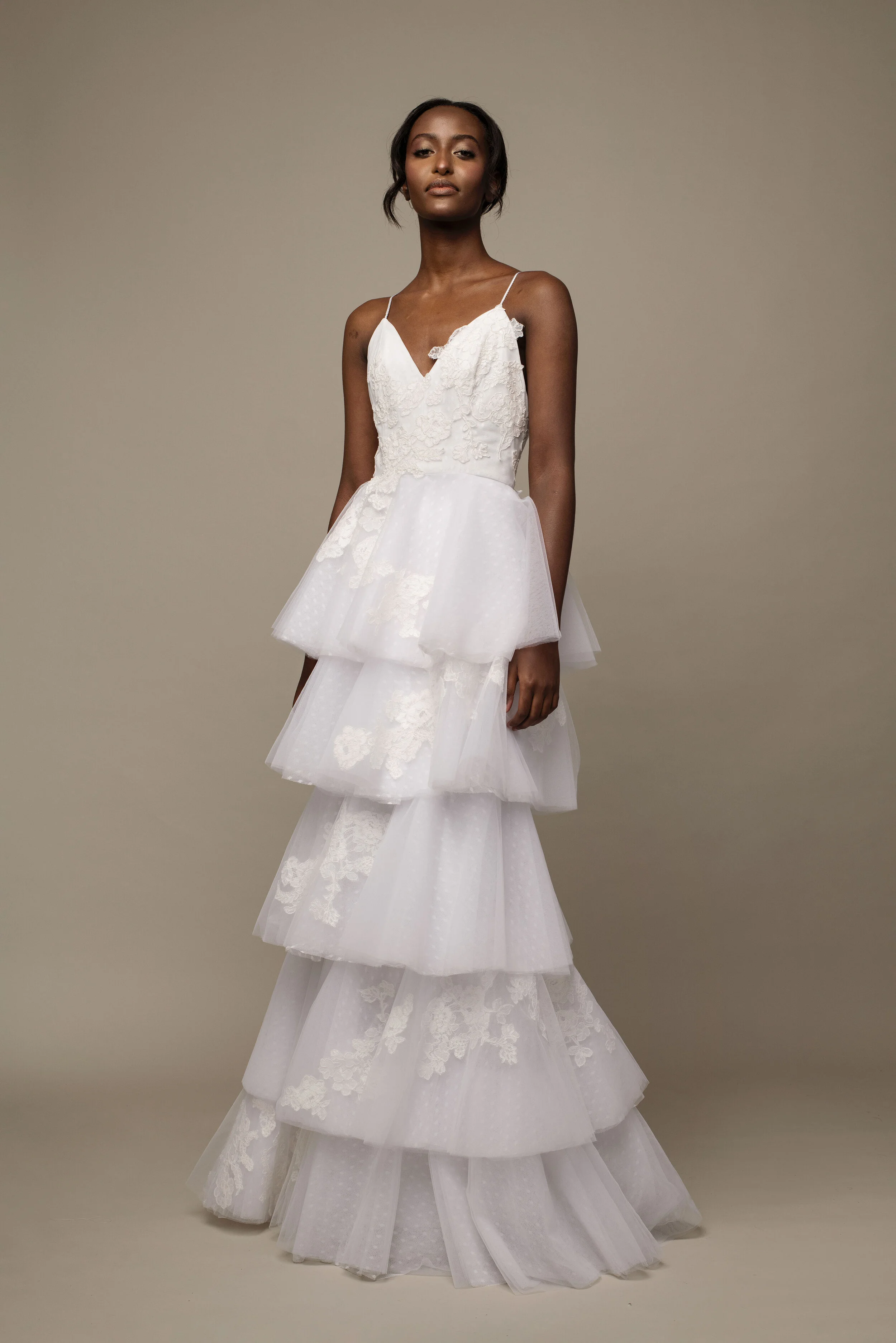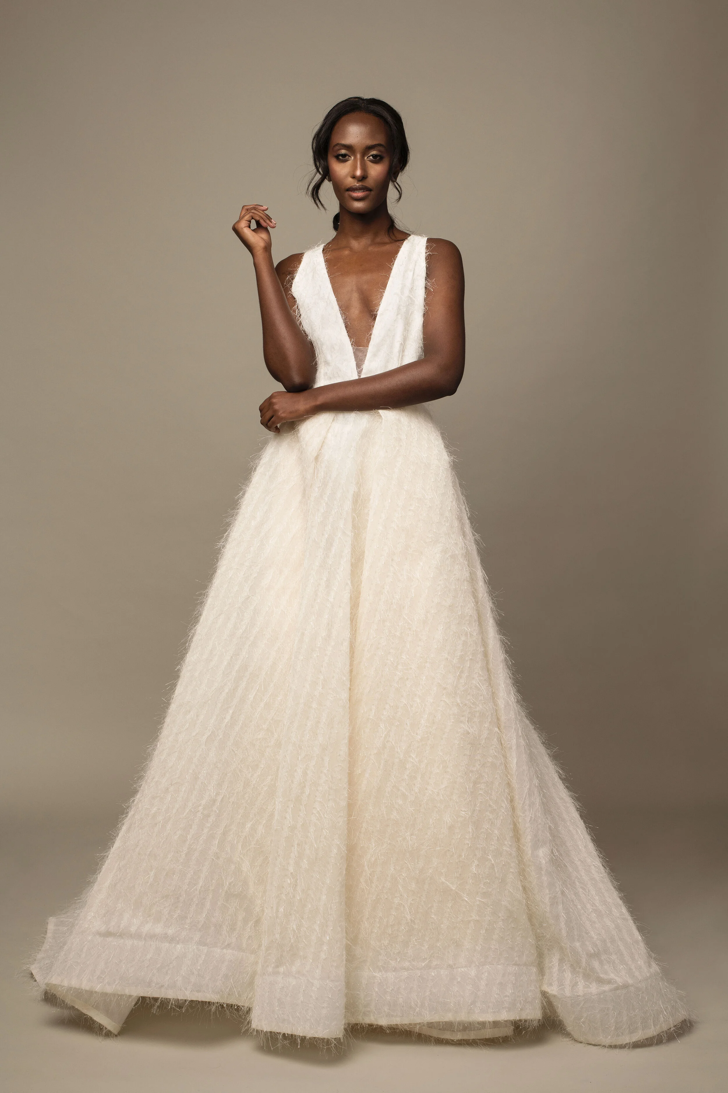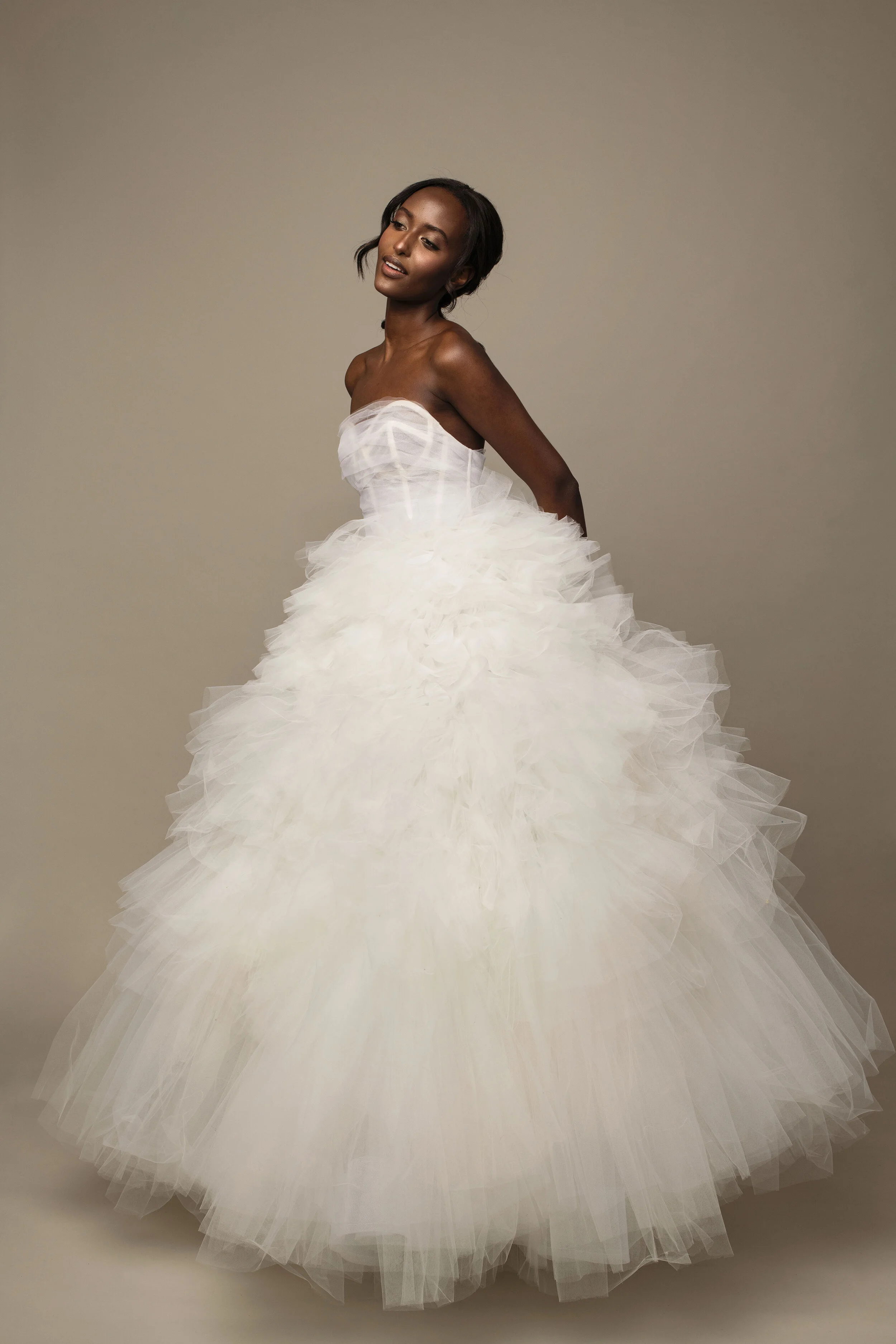 This bridal collection is an evening under the summer night sky. Twinkling stars are captured in the subtle sparkle of the beads and sequins while tulle ruffles float like diaphanous white clouds. The gentle breeze flows through the soft and airy fabrics and silhouettes.