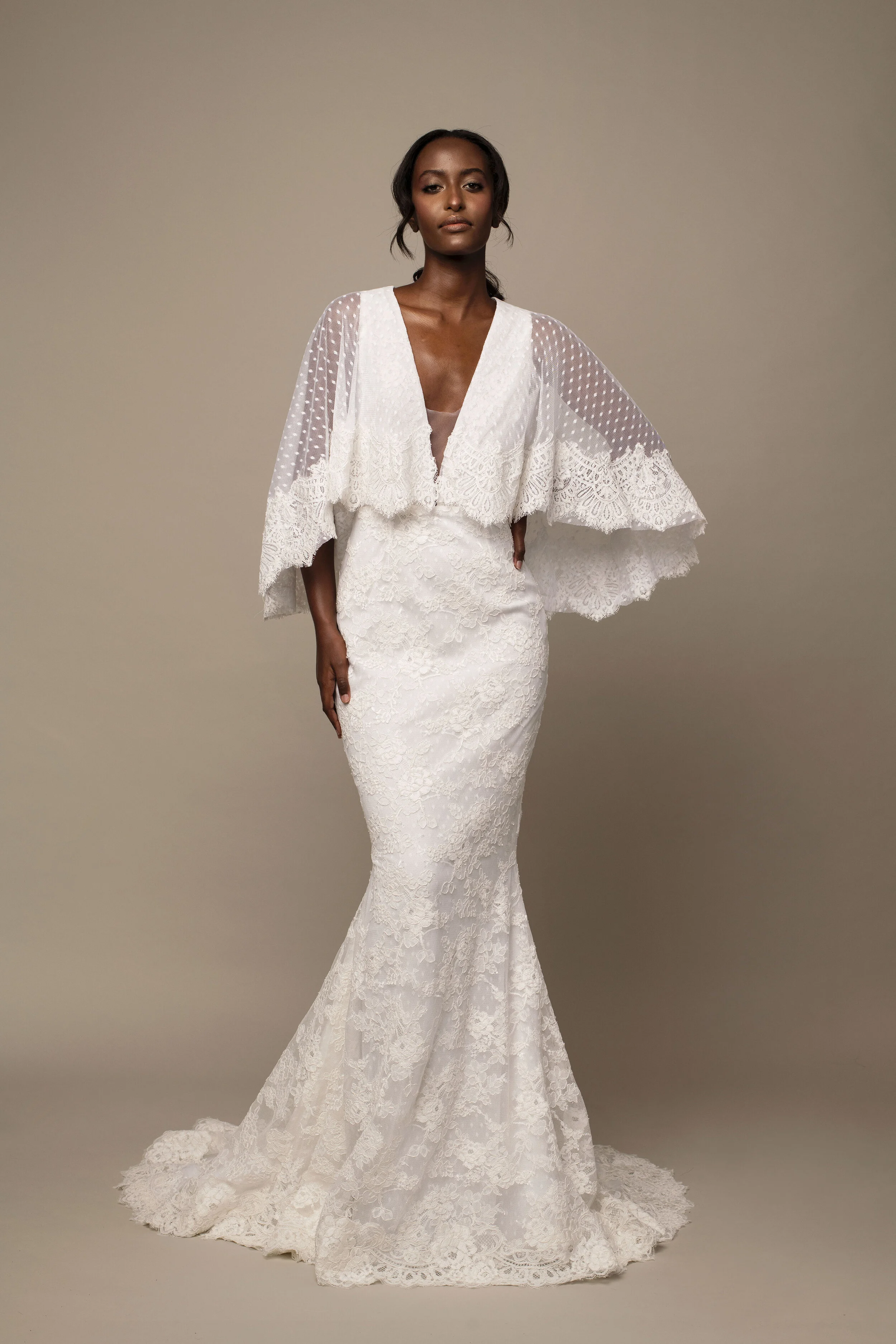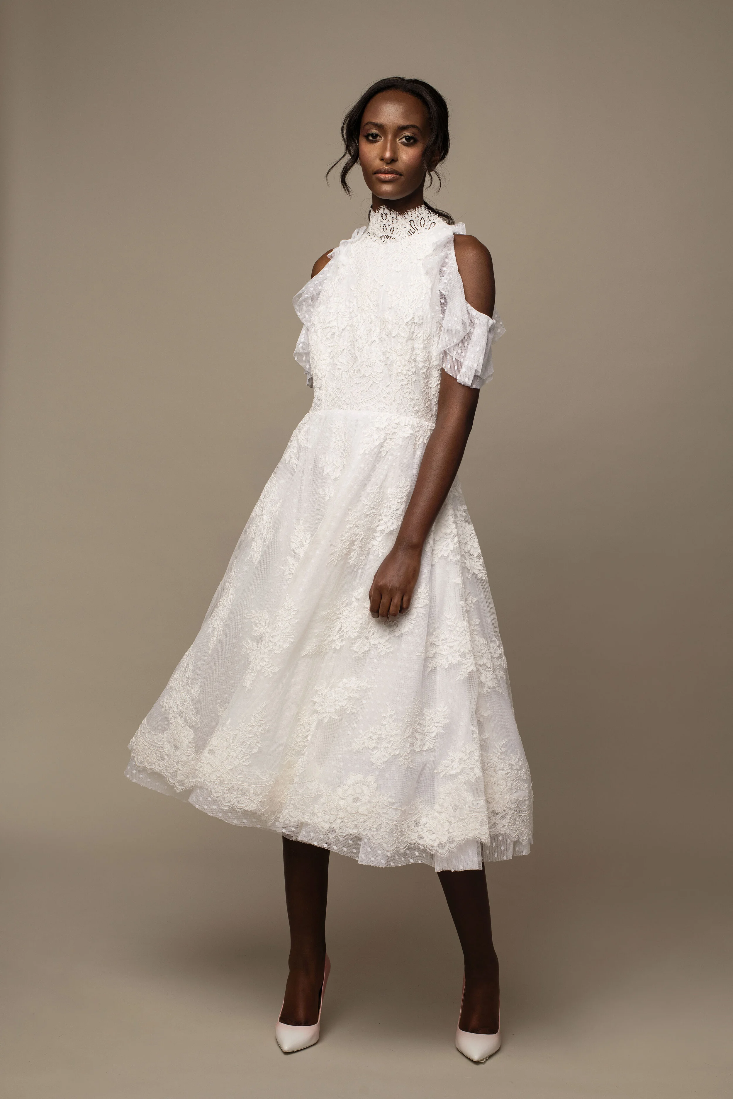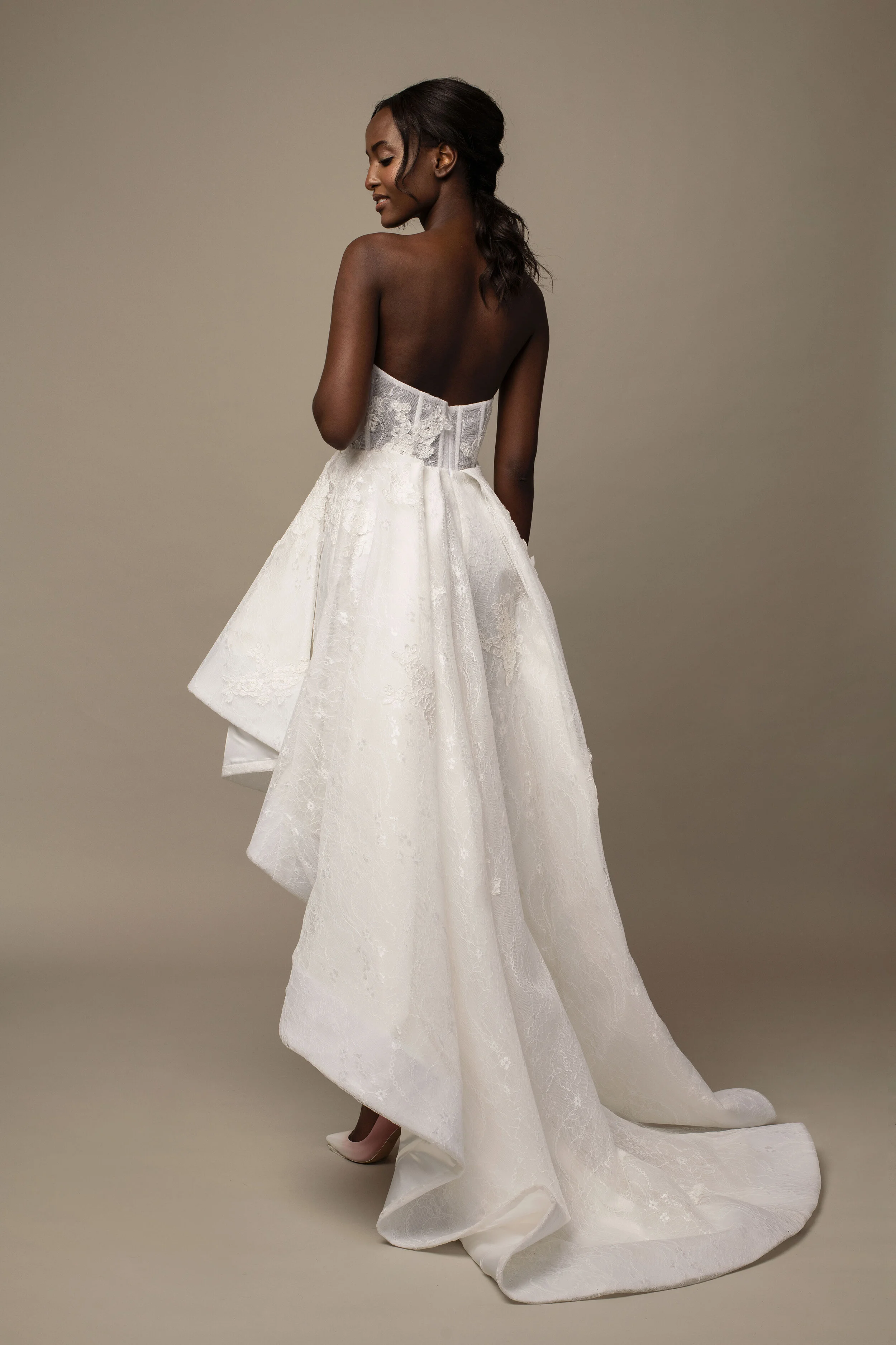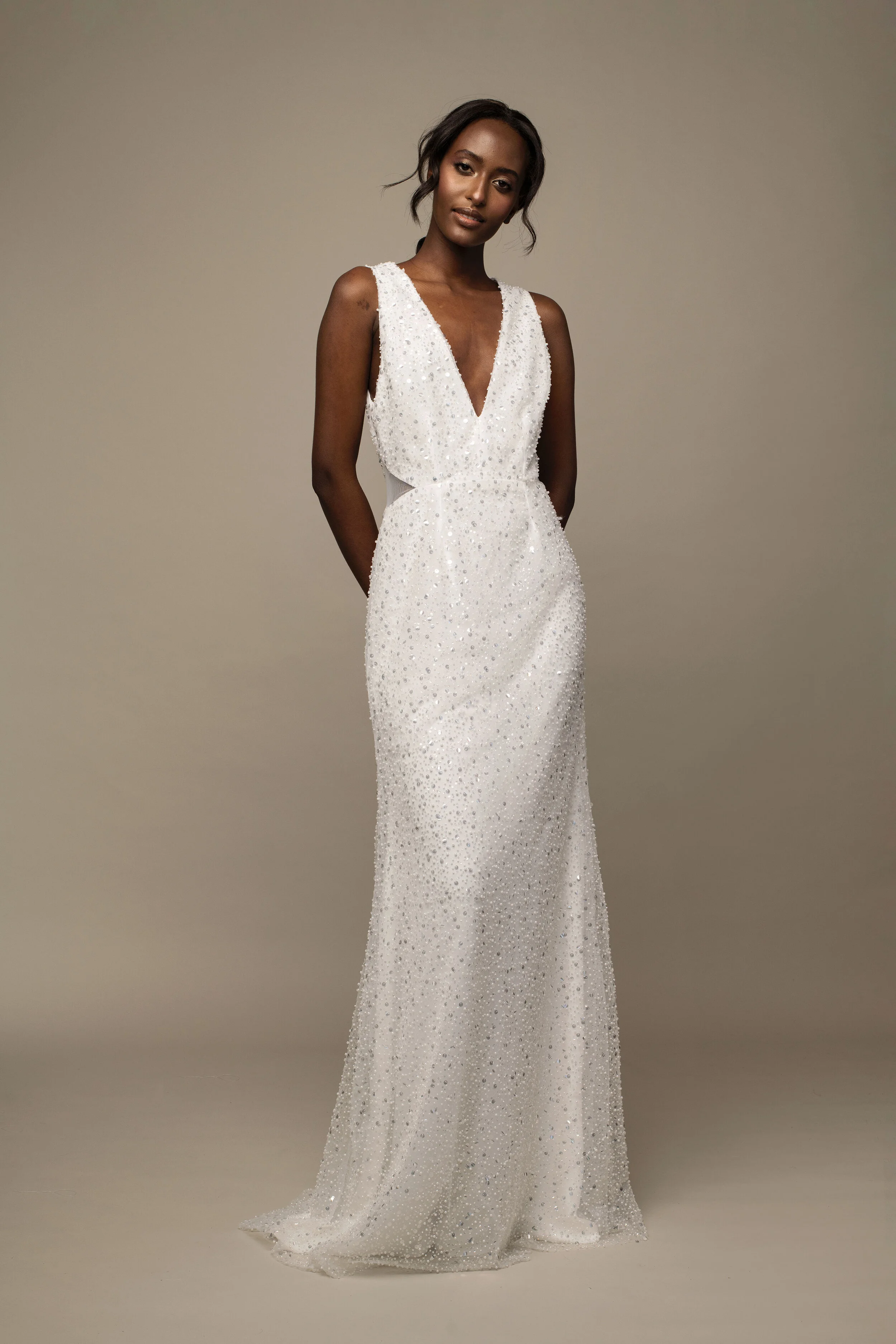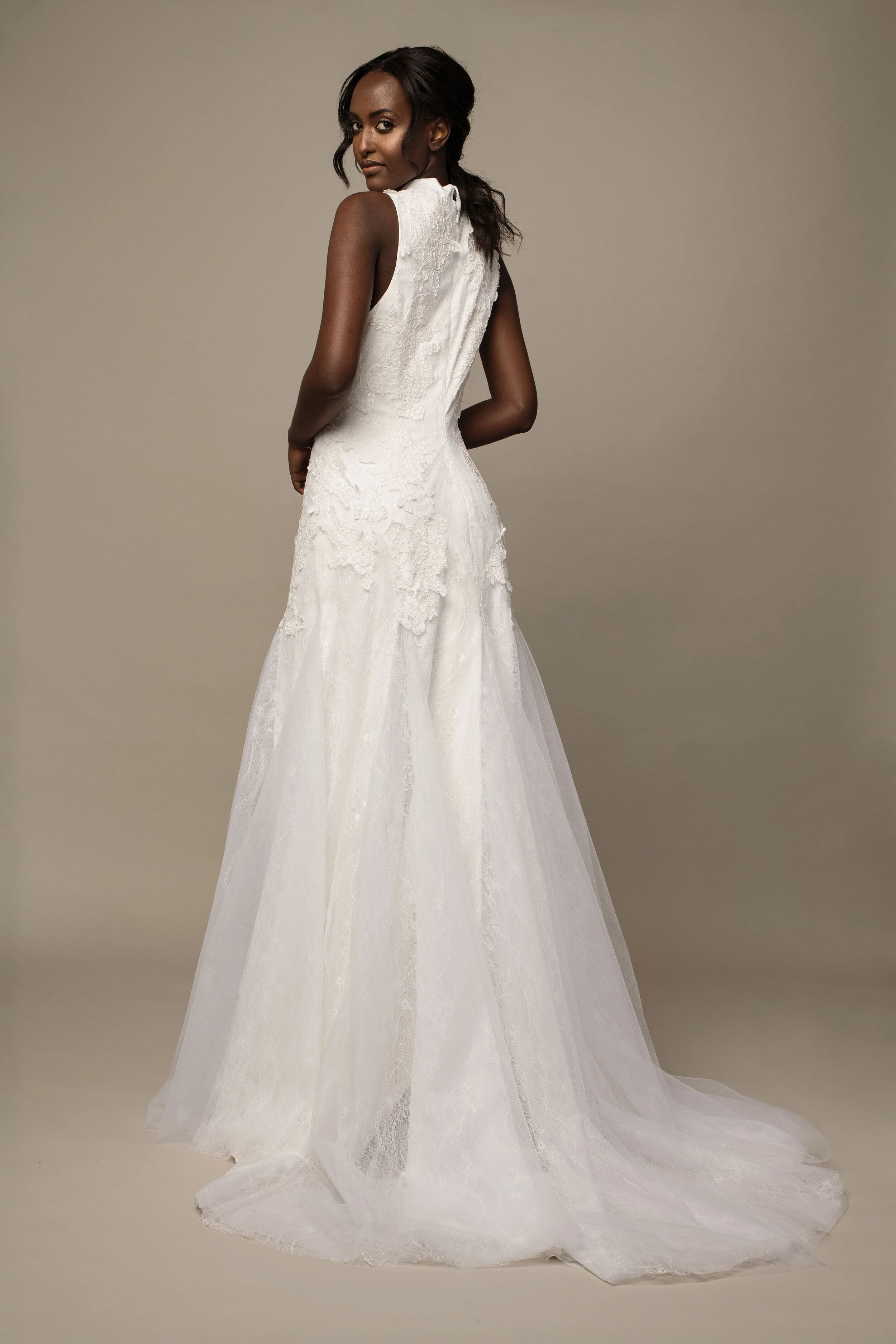 This bridal collection is an evening under the summer night sky. Twinkling stars are captured in the subtle sparkle of the beads and sequins while tulle ruffles float like diaphanous white clouds. The gentle breeze flows through the soft and airy fabrics and silhouettes.